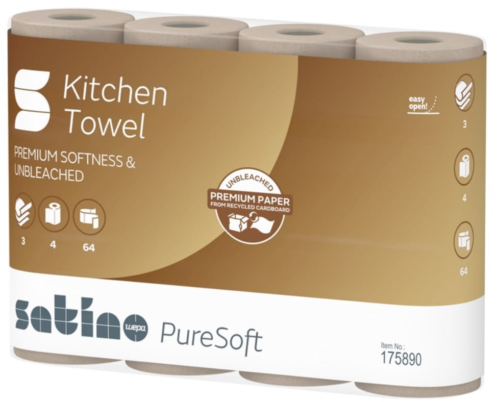 Papierowe ręczniki kuchenne Satino PureSoft: pierwsze papierowe ręczniki kuchenne klasy premium od Satino by WEPA, które są w całości produkowane z i kartonowych z recyklingu. Niebielone ręczniki kuchenne Satino PureSoft oferują niezrównaną miękkość i chłonność, są przeznaczone do kontaktu z żywnością i wyjątkowo ekologiczne.